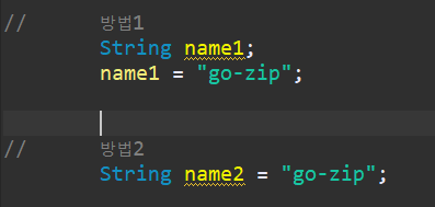 방법2는 선언(declare)과 동시에 변수 초기화(initialize)를 해준것입니다.
