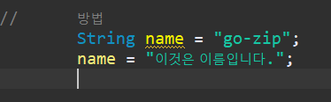 다음에 바꿀때는 변수값 할당또는 변수값 변경이라고 합니다.