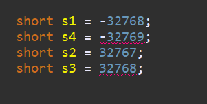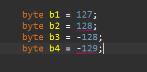 b1은 byte의 범위 내 숫자이기 때문에 잘 적용되었습니다. 하지만 b2의 경우는 정해진 범위를 벗어났기 때문에 빨간 줄이 생기며 오류가 발생하였습니다. 음수의 범위 또한 마찬가지입니다.